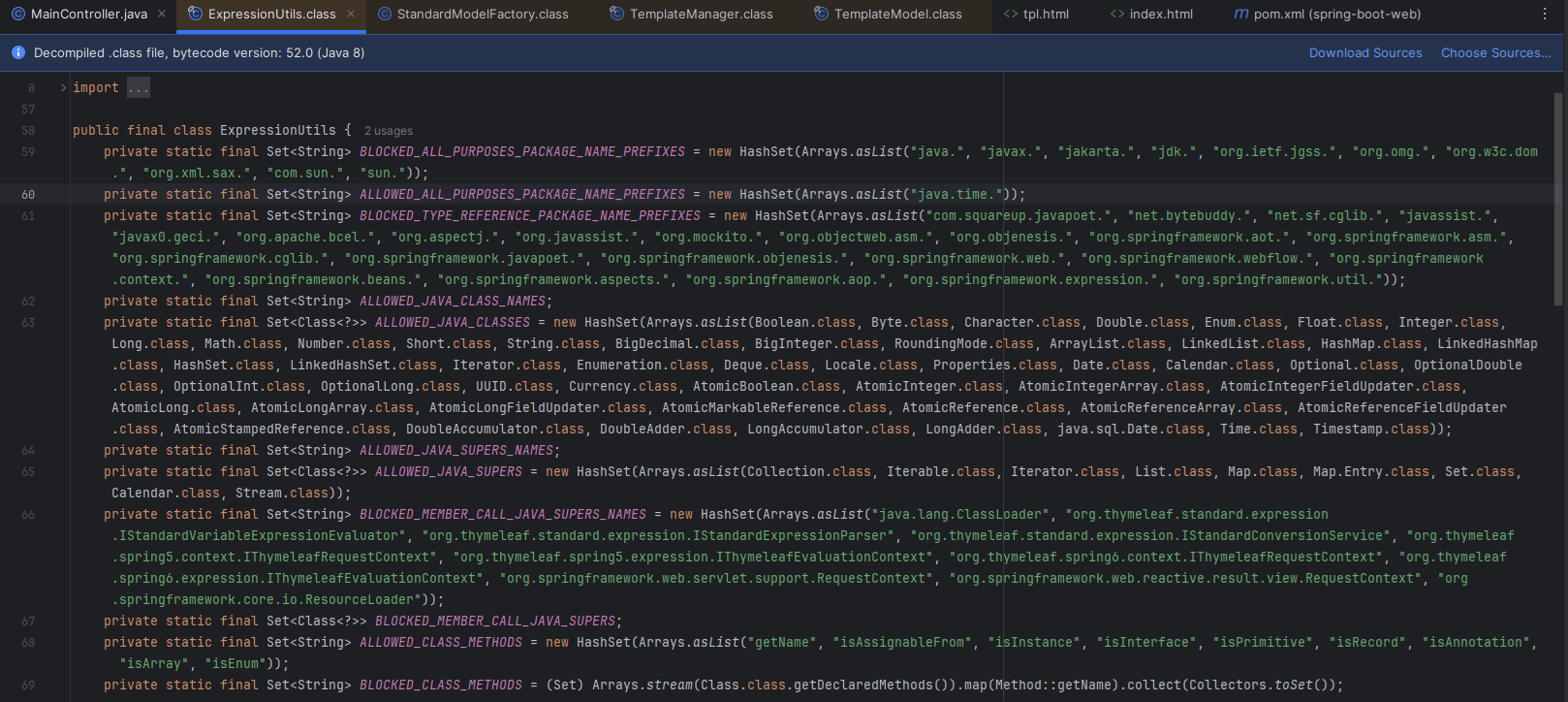 What is quite interesting to notice regarding the Thymeleaf’s filtering process is that it uses a denylist approach. In ExpressionUtils class, one can notice that the following packages are denied (except some basic classes):